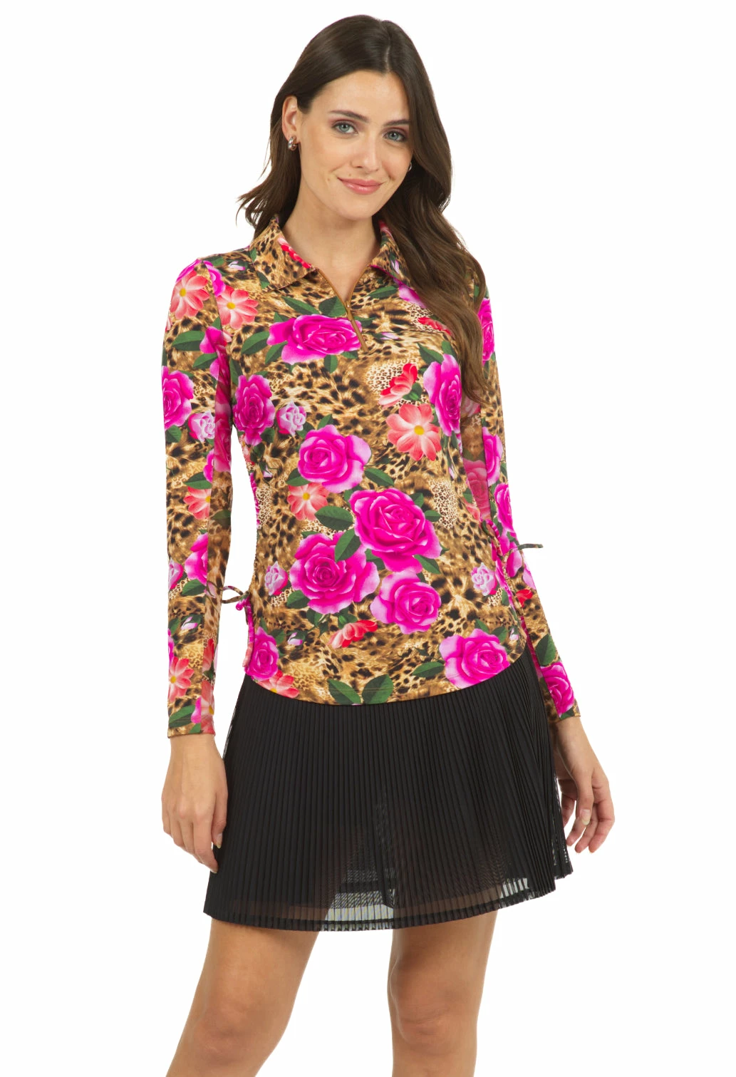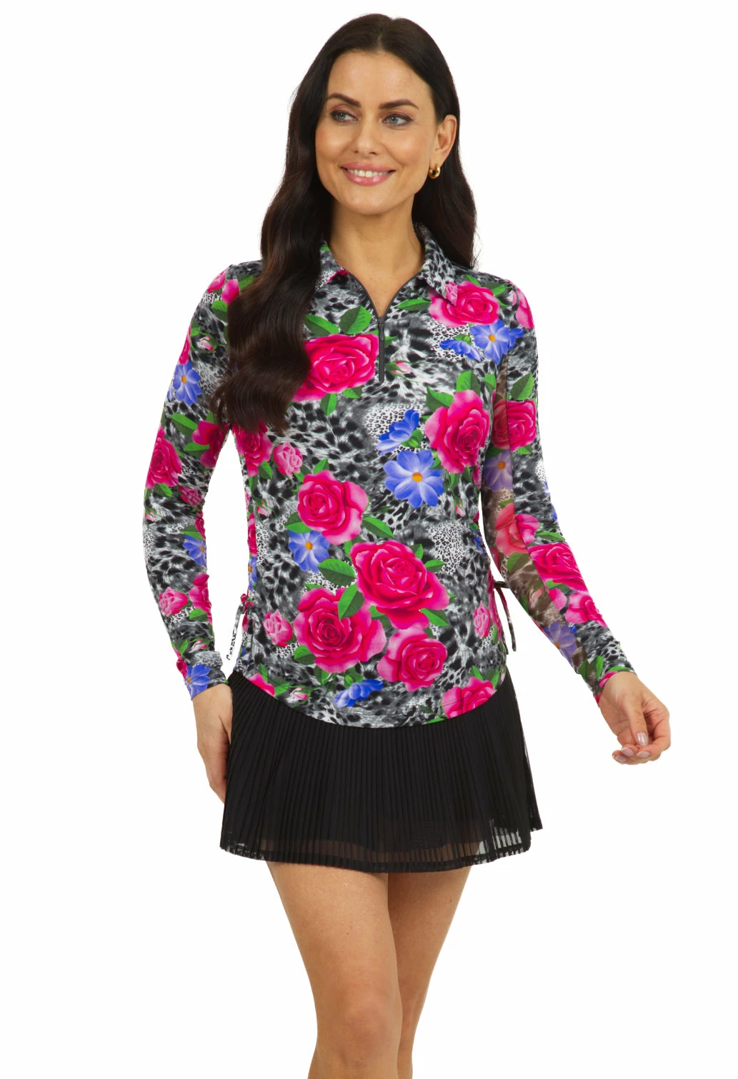This flattering polo top has adjustable ties along the sides to let you create the length and look you choose. This silhouette features our patented Ice�il Cooling Technology lowering your skin temperature up to five degrees. The mesh inner arm panels provide additional ventilation to keep you cool and dry for all your athleisure activities. UPF 50+ sun protection protects you from the sun along with anti-bacterial and moisture wicking properties allows you to look and feel your best on the hottest humid days.